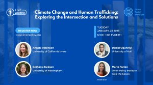 Orion Policy Institute hosted a live webinar on Tuesday, January 28, 2025, between 12:00 – 1:00 pm EST, titled “Climate Change and Human Trafficking: Exploring